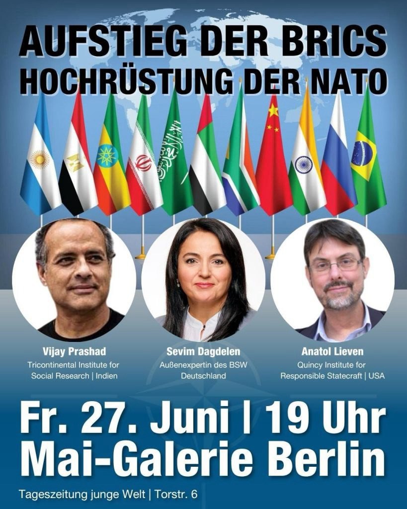 Mit Vijay Prashad (Direktor Tricontinental Institute for Social Research, Indien), Anatol Lieven (Direktor des Eurasienprogramms am Quincy Institute for Responsible Statecraft, USA) und Sevim Dagdelen (Außenexpertin BSW, Deutschland)