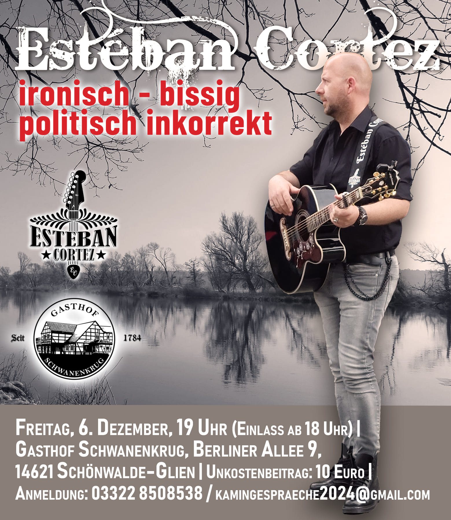 Estéban Cortez steht für handgemachte Musik mit kritischen und bisweilen bissigen Texten, die aber meist auch mit einer Prise Humor gewürzt sind. Am Nikolaustag spielt Estéban Cortez im Schwanenkrug in Schönwalde/Glien.