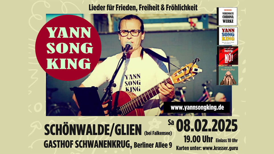 Der selbsternannte „schwurbelnde Liederkönig“ Yann Song King macht seinem Namen alle Ehre und bringt frischen Wind in die Musikwelt. Bekannt geworden durch seine musikalischen Beiträge in turbulenten Zeiten, hat er sich mittlerweile als alternativer Alleinunterhalter etabliert, der mit seinen Parodien und Ohrwürmern für ausgelassene Stimmung sorgt. Seine drei Alben bieten eine stilistische Vielfalt, doch live beweist er, dass er allein mit seiner Gitarre die Bühne zum Beben bringen kann.