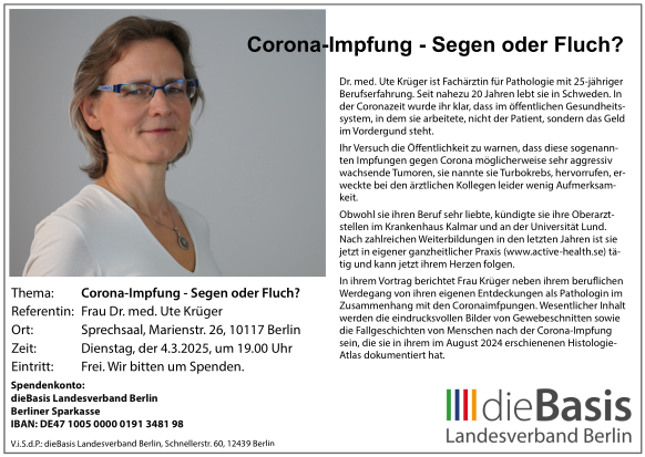 Corona-Impfung - Segen oder Fluch? Referentin: Frau Dr. med. Ute Krüger Sprechsaal, Marienstr. 26, 10117 Berlin Dienstag, der 4.3.2025, um 19.00 Uhr Eintritt frei. Um Spenden wird gebeten. Veranstalter: dieBasis (LV Berlin) Spendenkonto: dieBasis Landesverband Berlin Berliner Sparkasse IBAN: DE47 1005 0000 0191 3481 98 Dr. med. Ute Krüger ist Fachärztin für Pathologie mit 25-jähriger […]
