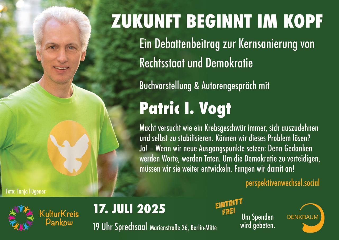 Patrick I. Vogt: Zukunft beginnt im Kopf Ein Debattenbeitrag zur Kernsanierung von Rechtsstaat und Demokratie Buchvorstellung & Autorengespräch 17.07..2025, 19 Uhr Sprechsaal Marienstraße 26 Berlin-Mitte Eintritt frei, um Spenden wird gebeten Veranstalter: Kulturkreis Pankow (Denkraum)