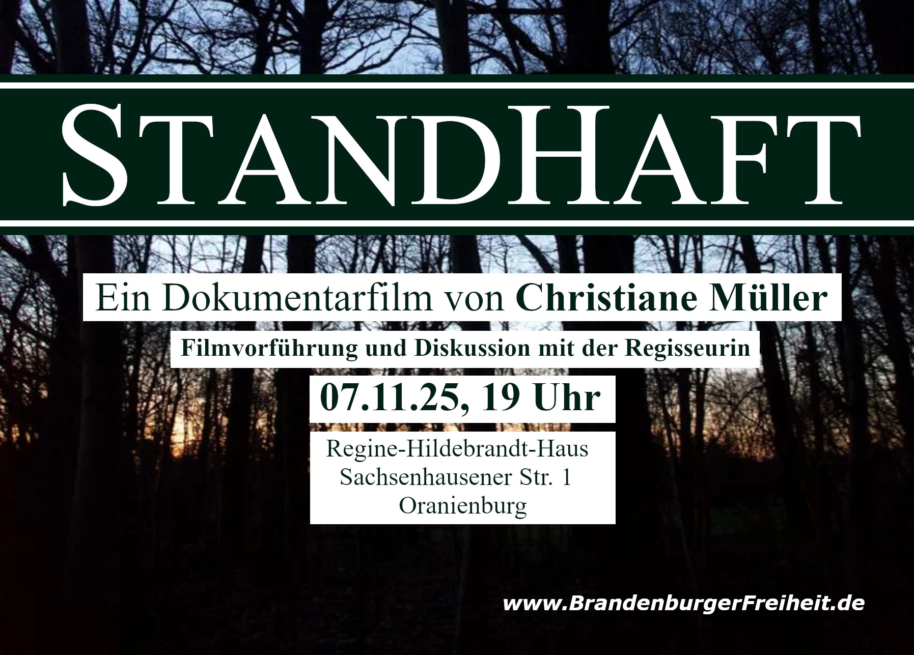 Regine-Hildebrandt-Haus Sachsenhausener Str. 1, OranienburgStandHaft Ein Film von Christiane Müller - Filmvorführung und Publikumsgespräch Der Umgang der Bundeswehr mit kritischen Soldaten, die sich nicht gegen Covid-19 impfen lassen wollten, gehört zu den dunkelsten Episoden der Corona-Krise. Der Dokumentarfilm "StandHaft" von Christiane Müller wirft ein Schlaglicht auf dieses Kapitel. In ihm kommen betroffene Soldaten ebenso zu Wort wie Rechtsanwälte, Mediziner […]
