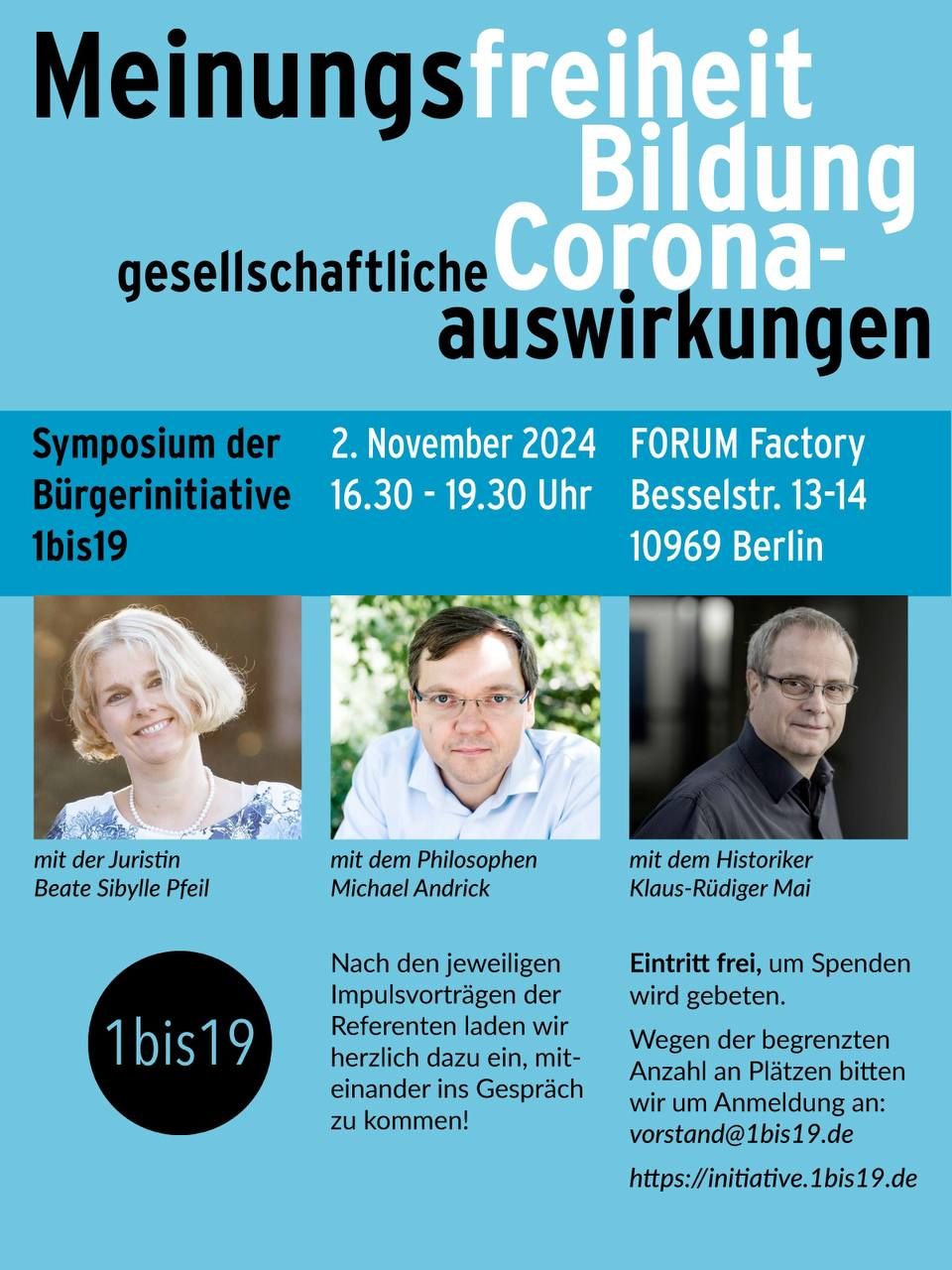 Meinungsfreiheit, Bildung, Corona - gesellschaftliche Auswirkungen Symposium der Bürgerinitiative 1 bis 19 mit Beate Sybille Pfeil (Juristin) Michael Andrick (Philosoph) Klaus-Rüdiger Mai (Historiker) Nach den jeweiligen Impulsvorträgen der Referenten lädt die Initiative alle Teilnehmer dazu ein, miteinander ins Gespräch zu kommen. Eintritt frei. Um Spenden wird gebeten. Wegen der begrenzten Anzahl an Plätzen bittet der […]