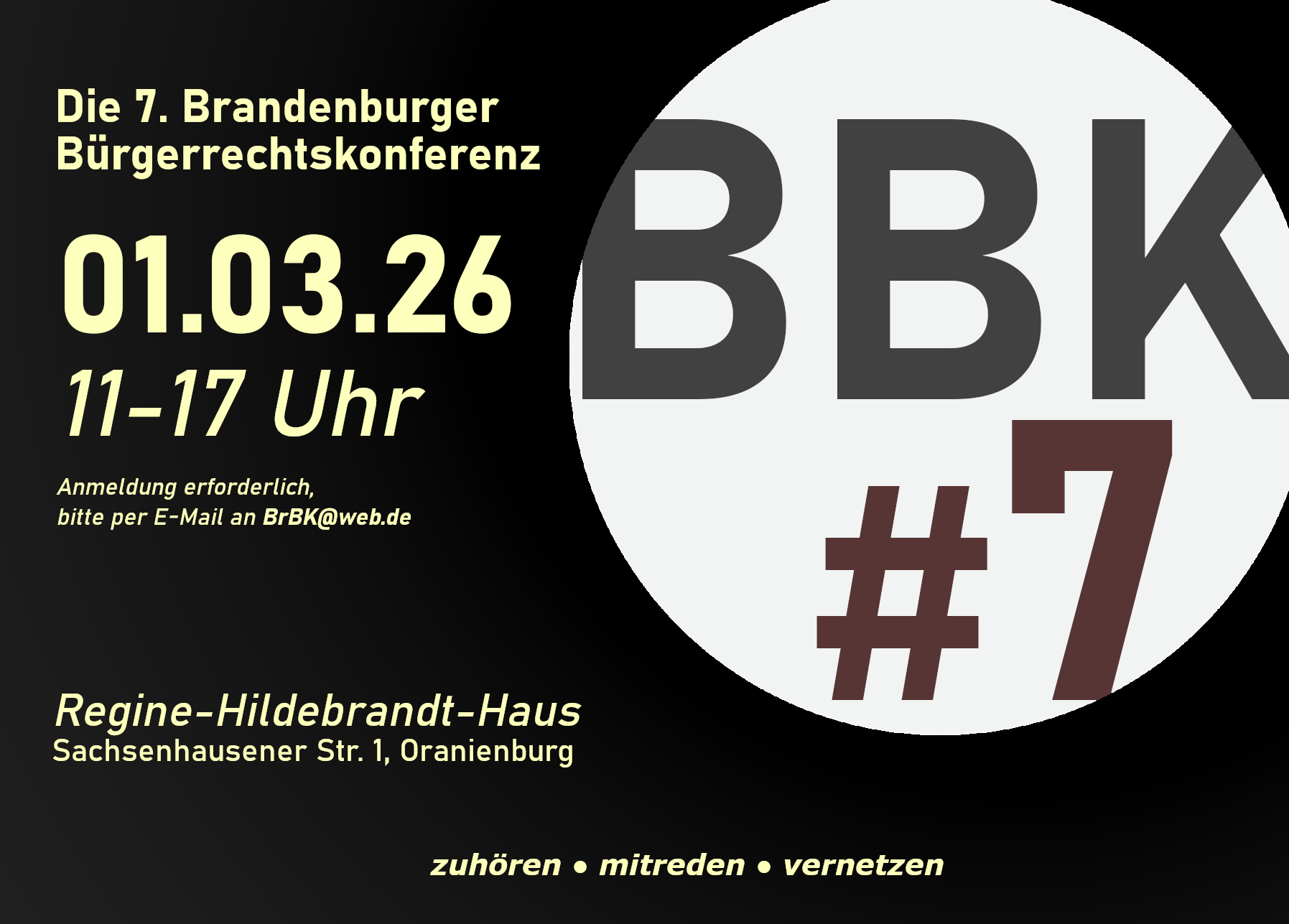7. Brandenburger Bürgerrechtskonferenz 01.03.2026, 11-17 Uhr Regine-Hildebrandt-Haus Sachsenhausener Str. 1, 16515 Oranienburg Anmeldung erforderlich, bitte per E-Mail an BrBK@web.de Programm*: Katja Arnold und Thomas Knott (Mittelstandsinitiative Cottbus): Die Mittelstandsinitiative – Kommunalwahl, Corona-Ausschuss. Ein kurzer Abriss über das Einmischen in die Politik. Mittagspause Stefan Böhme und Horst Jatzlauk (Bürgerforum Cottbus): Das Bürgerforum Cottbus: Die Wiederbelebung des […]