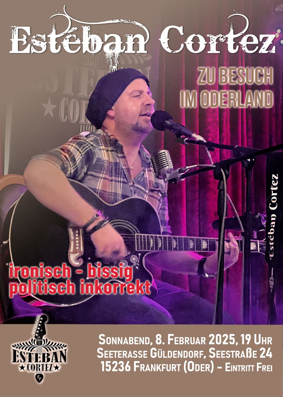 Estéban Cortez live Zu Besuch im Oderland mit neuem Album aber wie gewohnt ... ironisch-bissig & politisch inkorrekt Samstag, 08.02.2025, 19 Uhr Seeterasse Güldendorf, Seestraße 24, 15236 Frankfurt/O. Eintritt frei