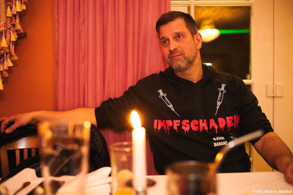 Björn Banane: Als DJ und Entertainer war ich von den Corona-Maßnahmen stark betroffen, insbesondere vom 1. Lockdown. Bis dahin habe ich aber der offiziellen Darstellung vertraut und die Maßnahmen unterstützt. Seit frühester Kindheit plagt mich ein schweres Asthma. Die Erinnerung an etliche Notarzteinsätze war immer noch frisch und weckte in mir das Gefühl, ebenfalls zur Risikogruppe zu gehören.