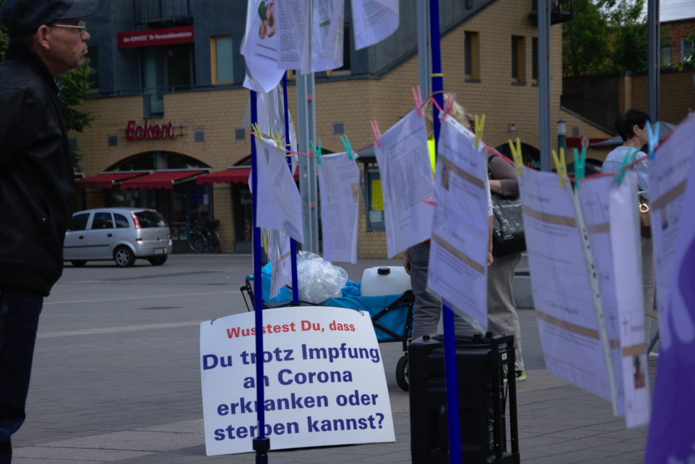 Immer wieder machen Passanten an einer Wäscheleine halt. Hieran hat die Bürgerinitiative Oberhavel-Steht-Auf Aufklärungsmaterial befestigt, das Konsumenten der Massenmedien in der Regel nicht erreicht. Bürger können sich hier informieren oder auch mit den anwesenden Aktivisten, die dort zu dritt vertreten waren, ins Gespräch kommen.