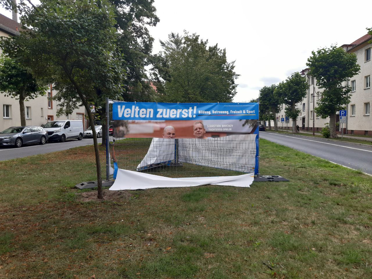 Anmerkung: Am Samstag, den 26. Juli 2025, sind mehrere Großplakate von Herrn Schulze in der Poststraße und am Bahnhof in Velten vermutlich mit einem Messer zerschnitten worden.