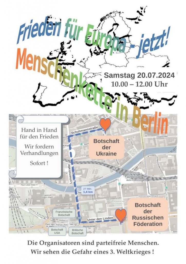 BF: Am 20.07.24 wollen Sie mit einer Menschenkette in Berlin eine symbolische Verbindung zwischen den Botschaften der Ukraine und Russlands schaffen. Warum wollen Sie sich nicht schlicht für oder gegen eine der Konfliktparteien positionieren?
