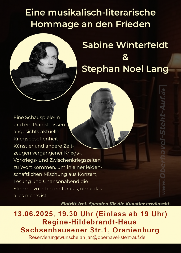 Die Schauspielerin Sabine Winterfeldt ist vielen aus Film und Fernsehen bekannt. Am 13.06.25 tritt sie mit Stephan Noel Lang in Oranienburg auf. Die Brandenburger Freiheit sprach mit der Wahl-Brandenburgerin über ihr Engagement für den Frieden, ihr Verhältnis zu Erich Mühsam und darüber, ob sie an einen erneuten Russland-Feldzug glaubt. Offen kritisiert Winterfeldt den Zustand der Gesellschaft und fordert mehr Basisdemokratie, moralische Integrität in der Politik sowie regelmäßige Drogentests für Spitzenfunktionäre.